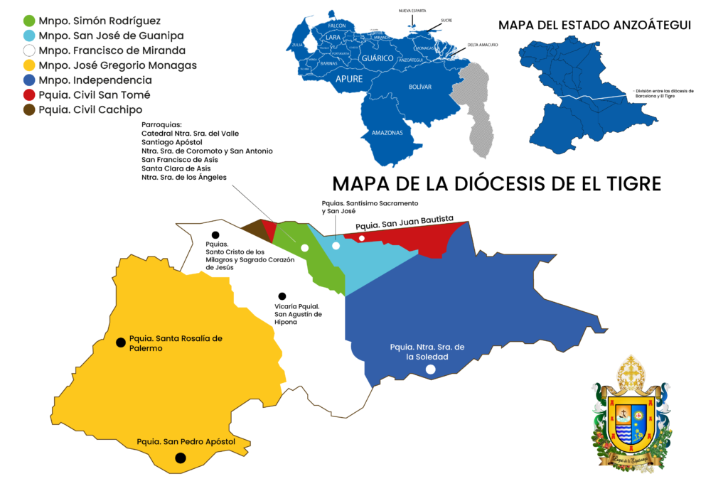 La Diócesis de El Tigre fue erigida el 31 de mayo de 2018 mediante la bula «Quo Satius Consuleretur» emitida por el Papa Francisco, con territorio desmembrado de la diócesis de Barcelona y haciéndola sufragánea de la Arquidiócesis metropolitana de Cumaná. En la siguiente imagen se muestra un mapa de la Diócesis: